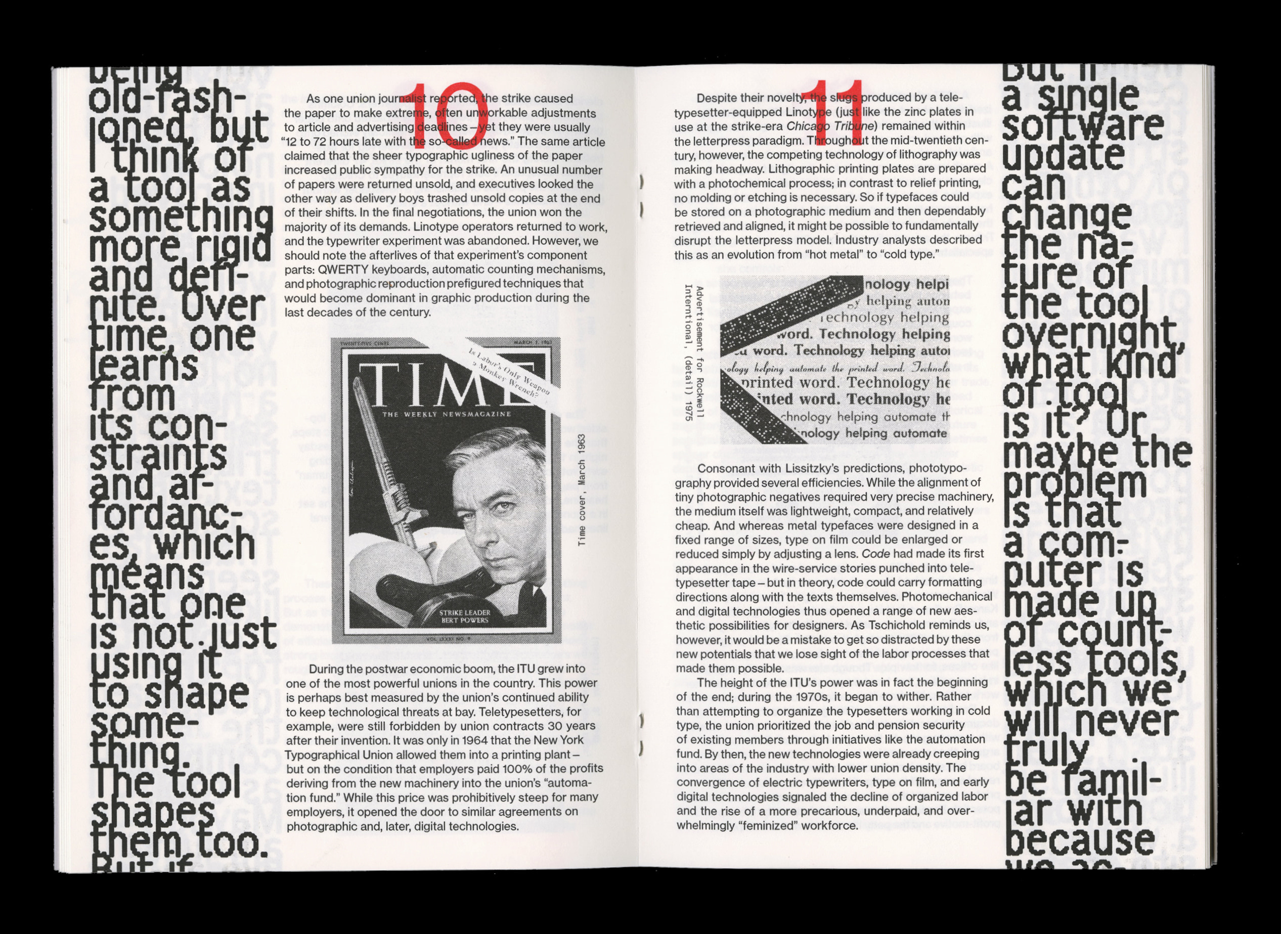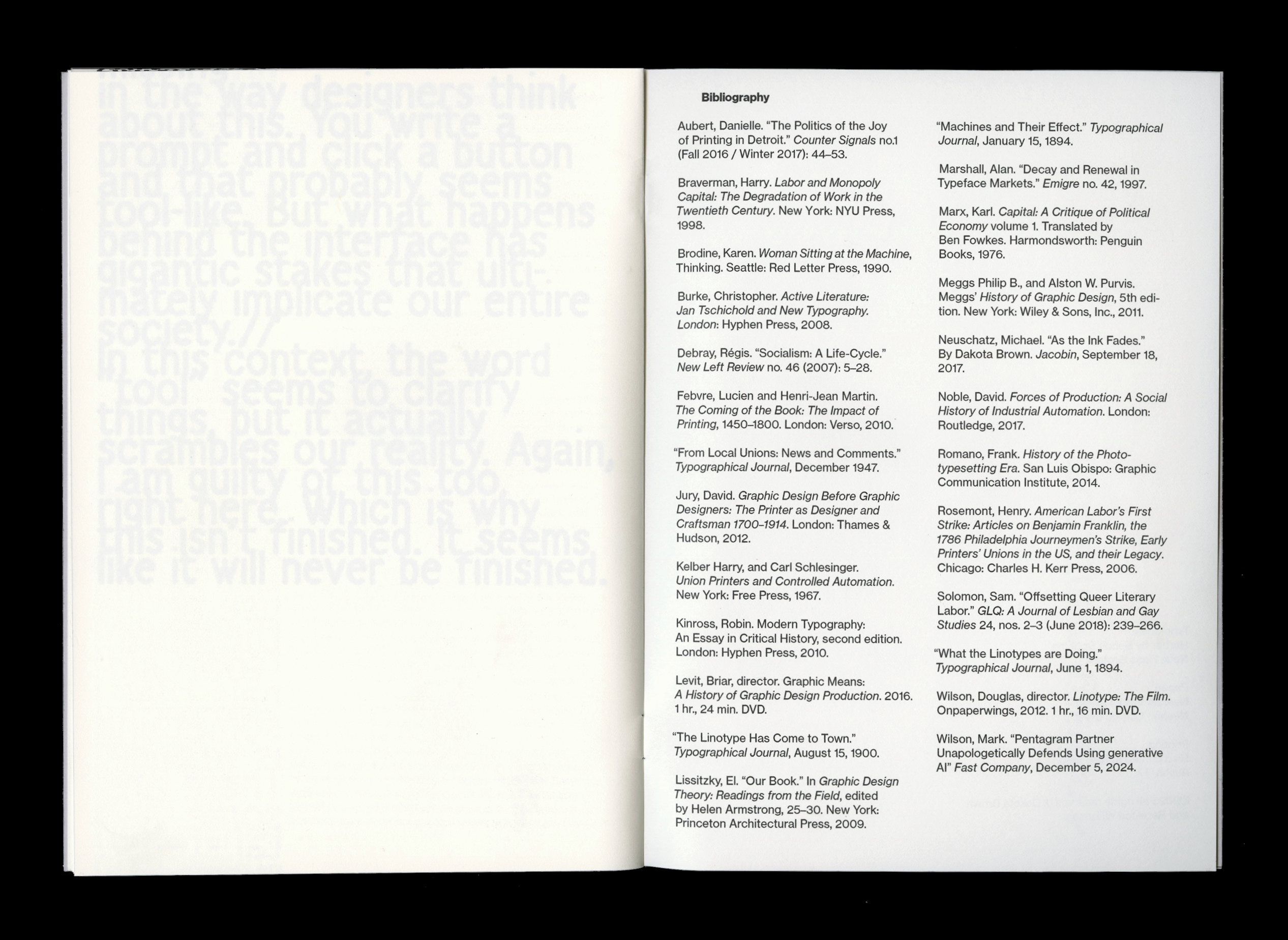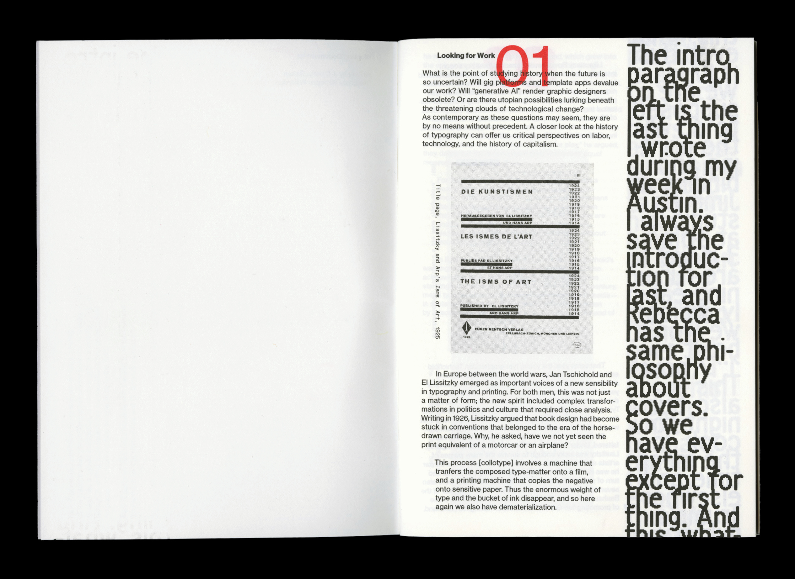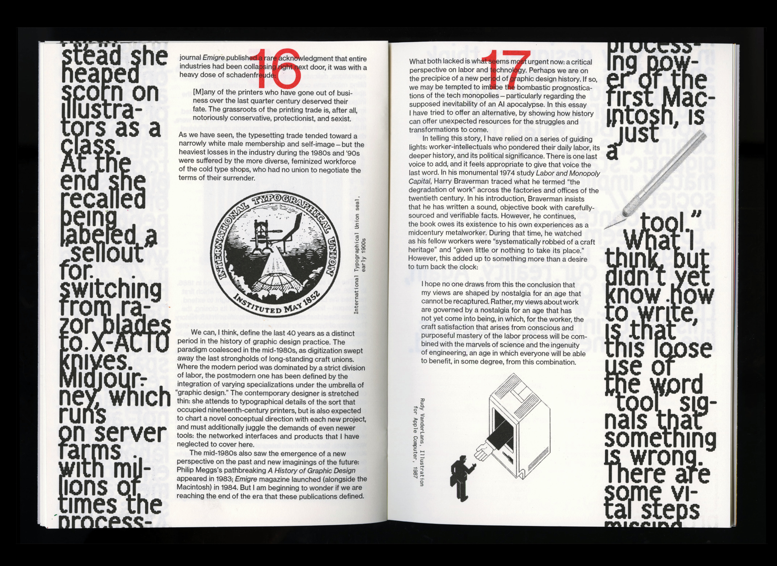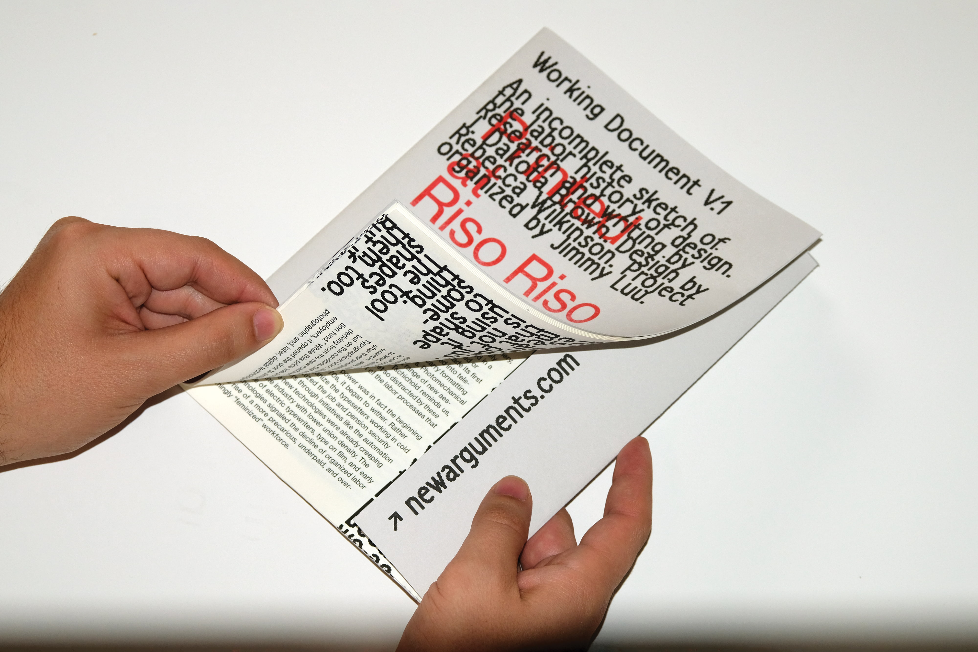 Our pamphlet, Working Document V.1, contains two contrasting texts. The primary essay, “Looking for Work,” adapts Dakota’s ongoing research into the labor history of graphic design for classroom use. This text sits in tension with a more immediate, stream-of-consciousness piece, written during the last hours of the pamphlet’s production.