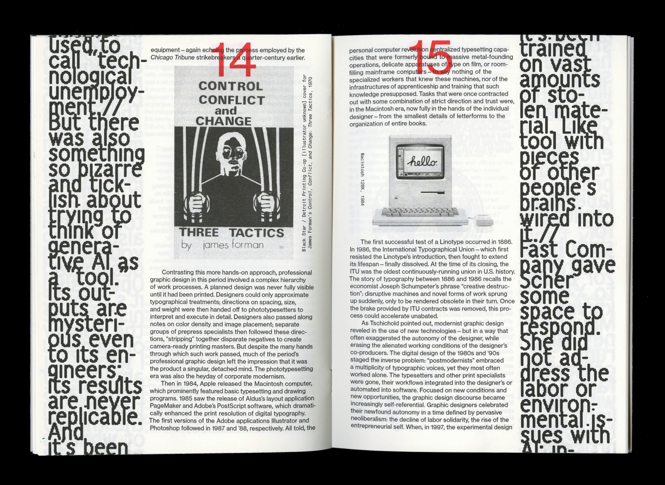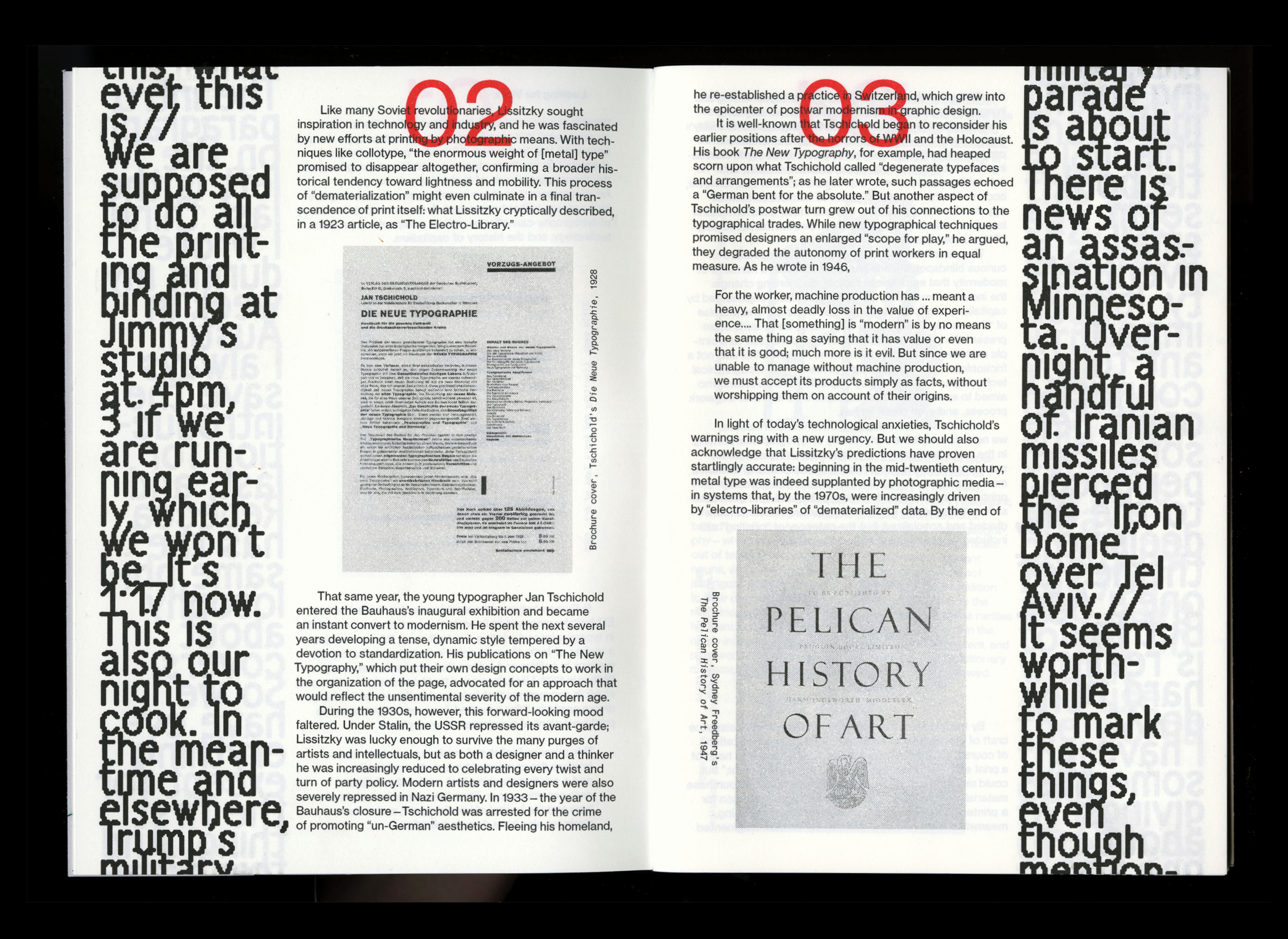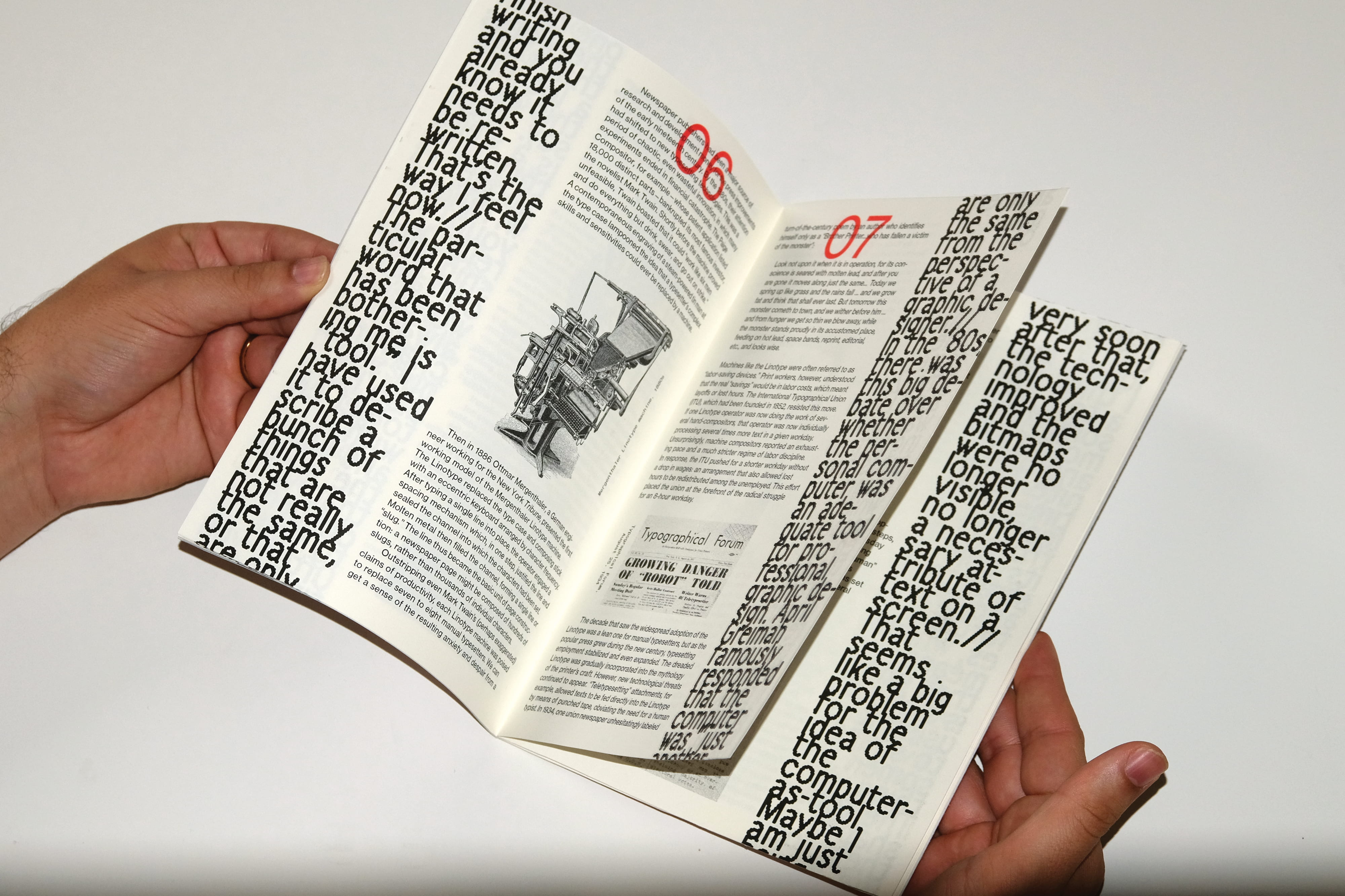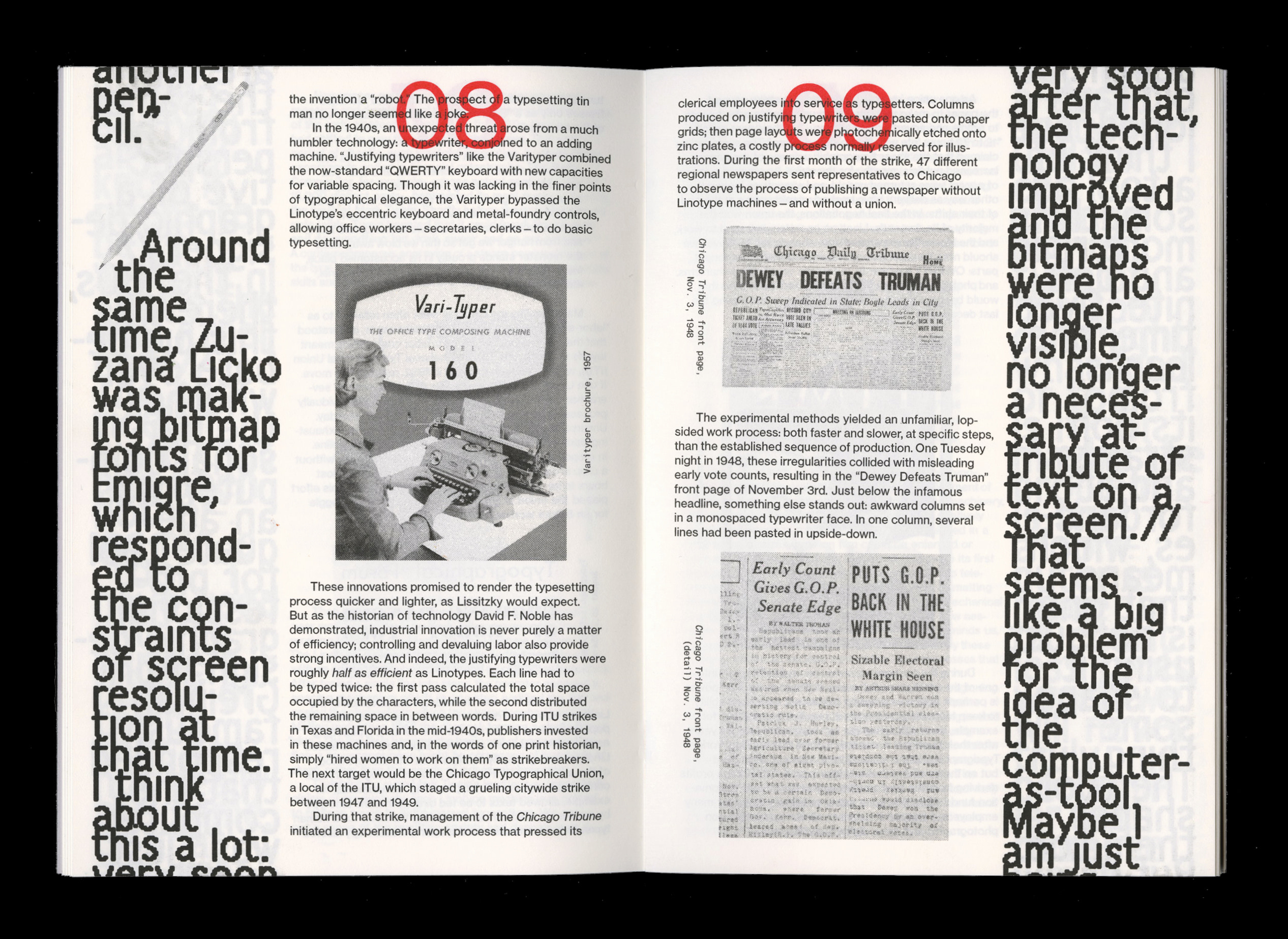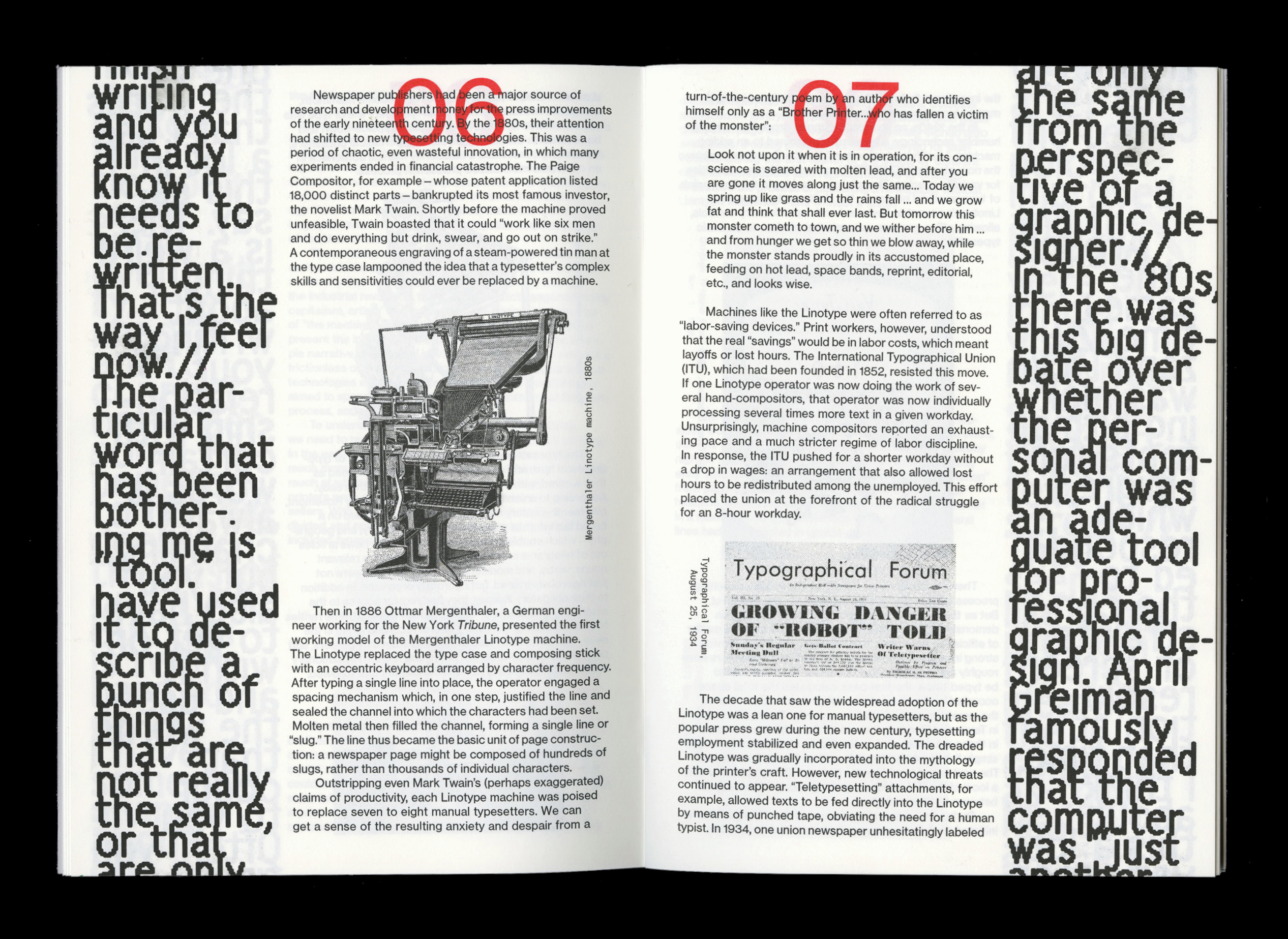 The essay in this publiation is set in Neue Haas Grotesk, an archetypal Swiss Modernist typeface, while the marginal text appears in BB Harber, a contemporary variable font released in 2023 and designed for the slipperiness of the screen.